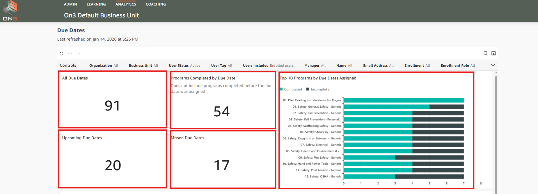 On3 Learn provides powerful reporting tools that allow administrators to track assigned training, monitor due dates, and evaluate learner completion. Using the Due Dates report in the Analytics tab, you can gain clear visibility into training progress across your enrollments.